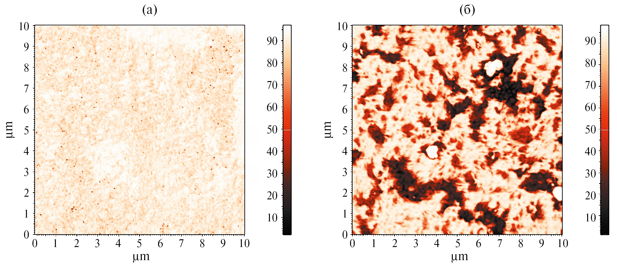 Рис. 4. АСМ изображения пленки ПЭ в фазовом контрасте: (а) после обработки в плазме аргона при токе разряда 80 мА и давлении 100 Па; (б) после обработки в плазме аргона, прививки и активной отмывке мономера.