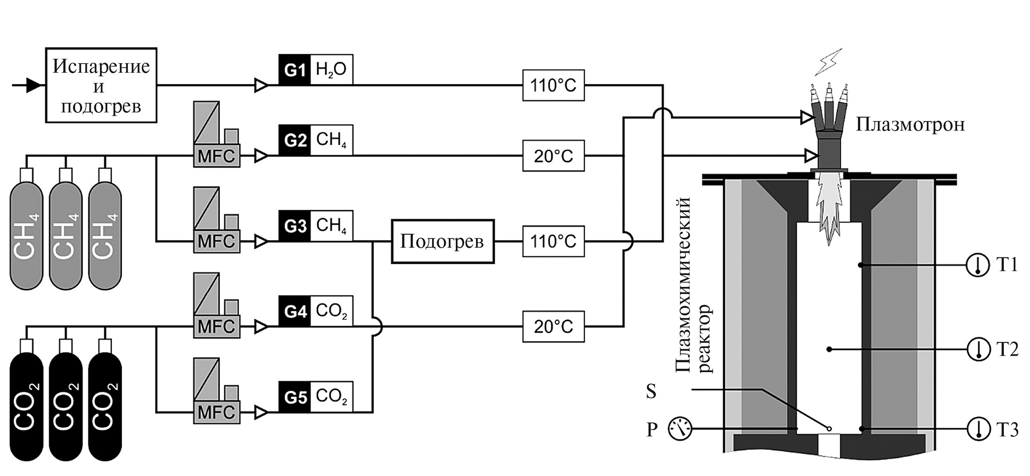 Экспериментальная установка состояла из высоковольтного плазмотрона переменного тока, подключенного к плазмохимическому линейному реактору, источника тока и источников газов. Дополнительно отбирались и анализировались пробы на состав синтез-газа. Общая схема процесса представлена на рис. 1 [6]. Плазмотрон сделан таким образом, чтобы газовые реагенты могли подаваться в разные зоны: приэлектродную и непосредственно в зону дуги. Такая конструкция позволяет определять влияние количества газов в разных зонах плазмотрона на его электрические параметры. Общая система конструкции представлена на рис. 2.