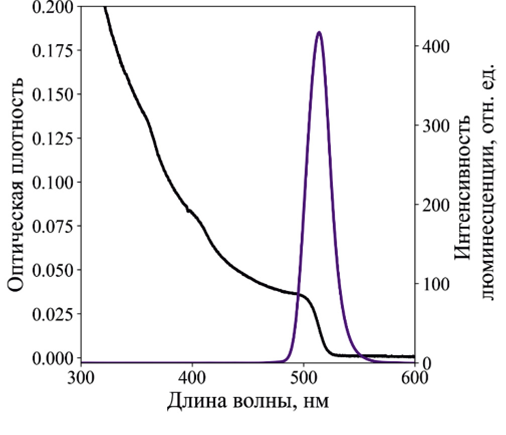 В результате синтеза были получены ККТ перовскитов CsPbBr3, характеризуемые спектрами поглощения и люминесценции, представленными на рис. 1. Средний размер был определен по размерной кривой и составил 8.3 нм.