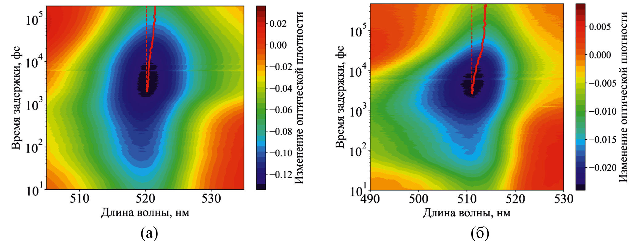 Рис. 3. Времяразрешенные матрицы разностного поглощения ККТ CsPbBr3 при энергии накачки 45 нДж образца, изготовленного методом (а) drop-casting; (б) spin-coating. Сплошной красной линией показано смещение пика просветления относительно красной пунктирной линии, указывающей на исходное положение пика.