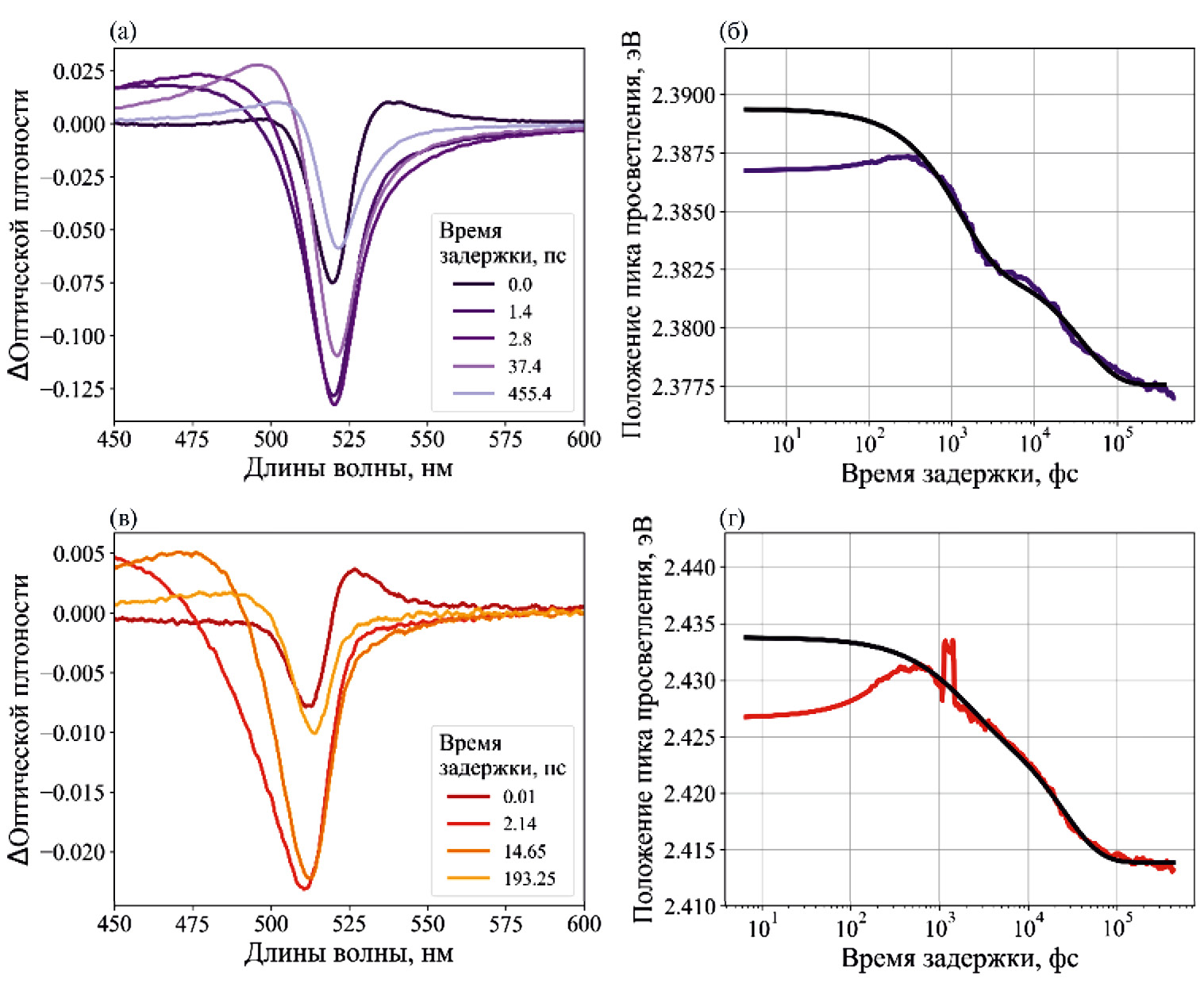 Рис. 4. Спектральная зависимость разности оптической плотности при разных временах задержки и зависимости энергий положения пика просветления от времени задержки. Пункты (а) и (б) для образца, изготовленного методом drop-casting; (в) и (г) – для образца, изготовленного методом spin-coating. Все зависимости приведены для энергии накачки в 45 нДж. На рисунках (б) и (г) фиолетовая и красная кривая – сдвиг пика просветления для образца, изготовленного методом drop-casting и spin-coating соответственно, черная – аппроксимация биэкспоненциальным спадом.