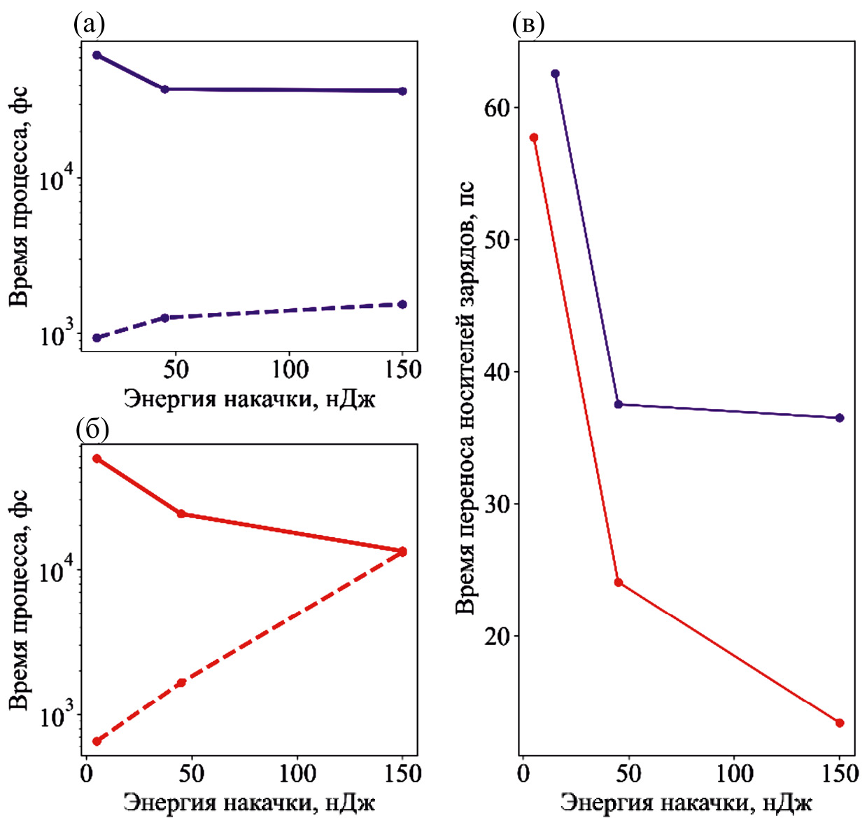 Рис. 5. Зависимость характерного времени процесса от энергии накачки: (а) “медленный” и “быстрый” процессы для образца, изготовленного методом drop-casting; (б) “медленный” и “быстрый” процессы для образца, изготовленного методом spin-coating; (в) “медленный” процесс для двух образцов. Пунктирными линиями изображен “быстрый” процесс, сплошными линиями обозначен “медленный” для каждого из образцов.