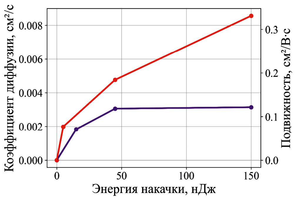 С другой стороны, логичным может показаться и предположение о том, что часть носителей заряда перемещается по другому механизму – для массива квантовых точек также возможен band-like механизм процесса переноса носителей заряда. К подобным выводам приходят авторы статьи [16], исследующие транспорт зарядов в плотноупакованных слоях ККТ PbS, а также в гетероструктурах, состоящих из данных ККТ, и перовскитной матрицы с помощью время-разрешенной микроскопии. В данной статье авторы приходят к выводу о реализации в исследуемой ими системе последовательно трех механизмов переноса носителей заряда. Причем времена наиболее быстрого из процессов совпадают по порядку величины с временами, характерными для “быстрого” процесса. Кроме того, любопытным является и тот факт, что по приведенным в статье графикам видно, что коэффициент диффузии для наиболее быстрого процесса падает с увеличением числа фотонов, приходящихся на одну квантовую точку (то есть с увеличением энергии накачки), следовательно, характерное время данного процесса пропорционально энергии накачки, что справедливо и для наблюдаемого нами “быстрого” процесса. В таком случае подвижность носителей заряда можно оценить как ~5 см2В–1с–1.