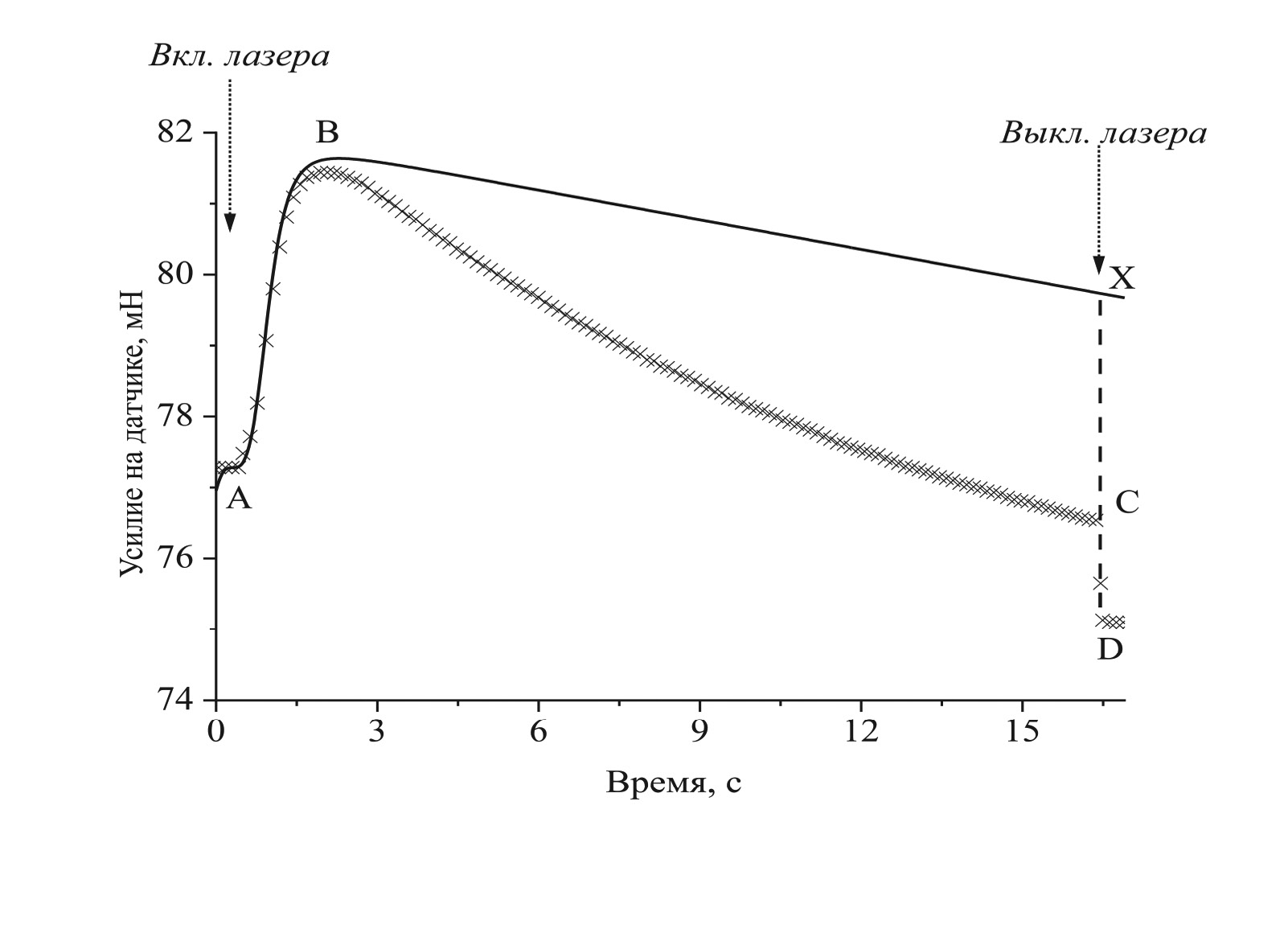 Первое, что следует отметить в экспериментальной кривой, – это снижение реактивной силы отдачи, воздействующей на мишень в конце облучения – спад кривой после прекращения облучения в точке tС ≈ 16.4 с, значительно меньше всплеска показаний в максимуме при tВ ≈ 2.0 с. Снижение реактивной силы отдачи в конце процесса, по сравнению с пиковой, экспериментально зарегистрировано при абляции всех полимеров, а величина снижения зависит как от типа полимера, так и от времени лазерного облучения.