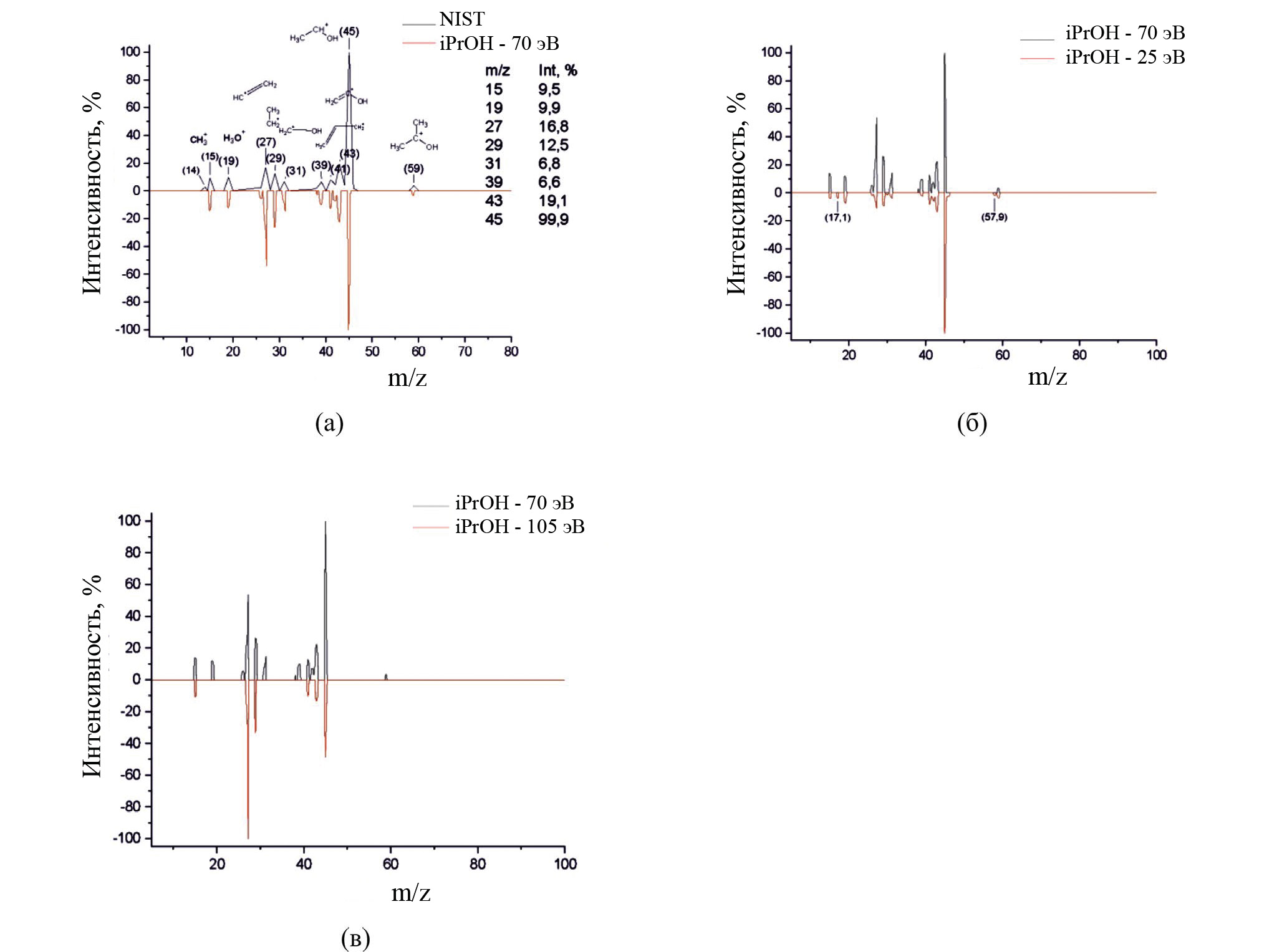 Рис. 1. Масс-спектры изопропанола, полученные ионизацией электронным ударом. (а) при 70 эВ в сопоставлении со спектром из БД NIST; (б) при 25 эВ в сопоставлении со спектром, полученным при 70 эВ; (в) при 105 эВ в сопоставлении со спектром, полученным при 70 эВ.