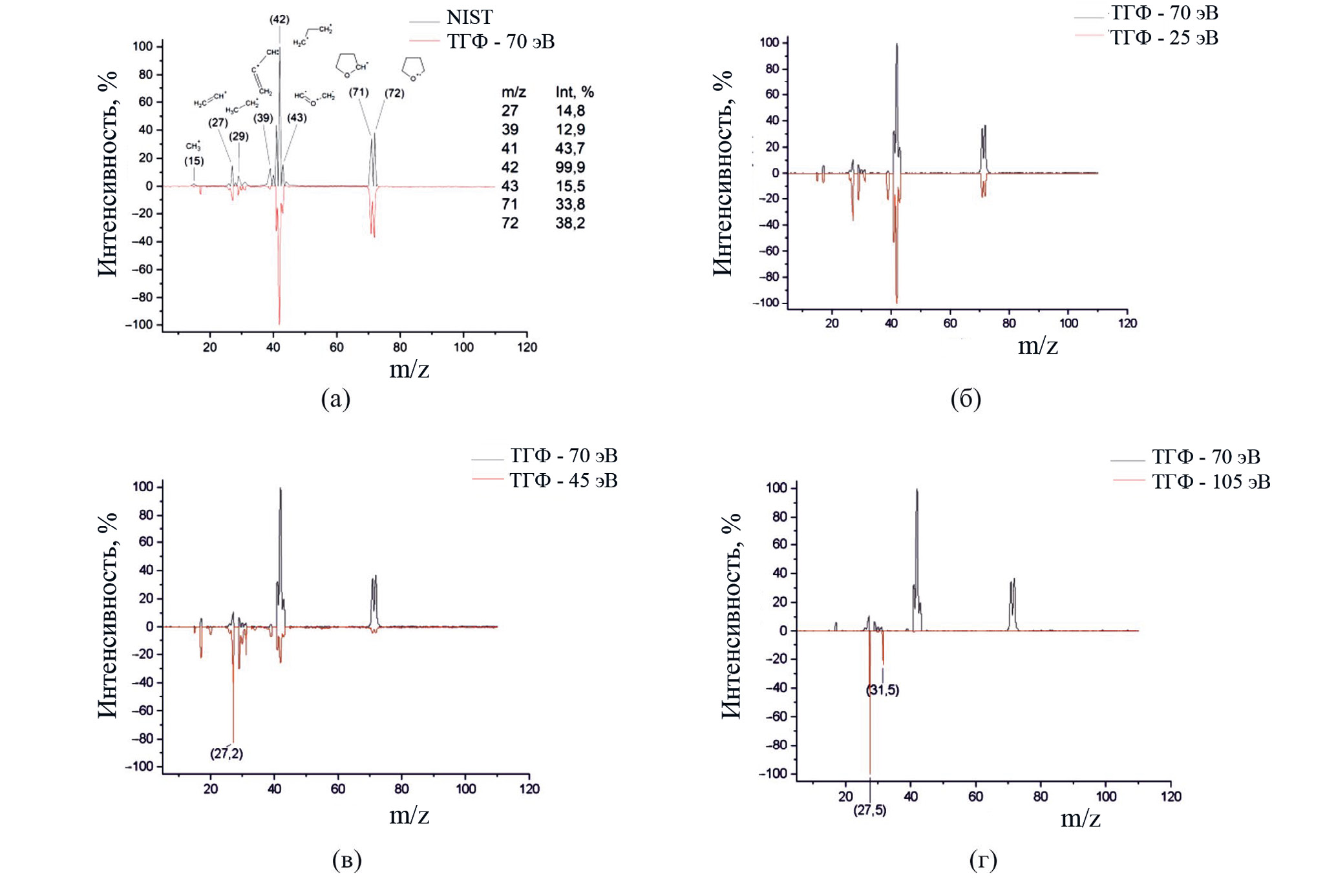 Рис. 2. Масс-спектры ТГФ, полученные ионизацией электронным ударом (а) при 70 эВ в сопоставлении со спектром из БД NIST; (б) при 25 эВ в сопоставлении со спектром, полученным при 70 эВ; (в) при 45 эВ в сопоставлении со спектром, полученным при 70 эВ; (г) при 105 эВ в сопоставлении со спектром, полученным при 70 эВ.