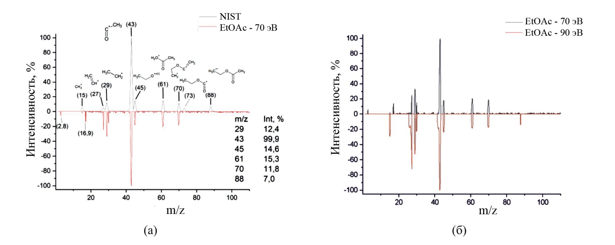 Рис. 3. Масс-спектры этилацетата, полученные ионизацией электронным ударом (а) при 70 эВ в сопоставлении со спектром из БД NIST; (б) при 90 эВ в сопоставлении со спектром, полученным при 70 эВ.