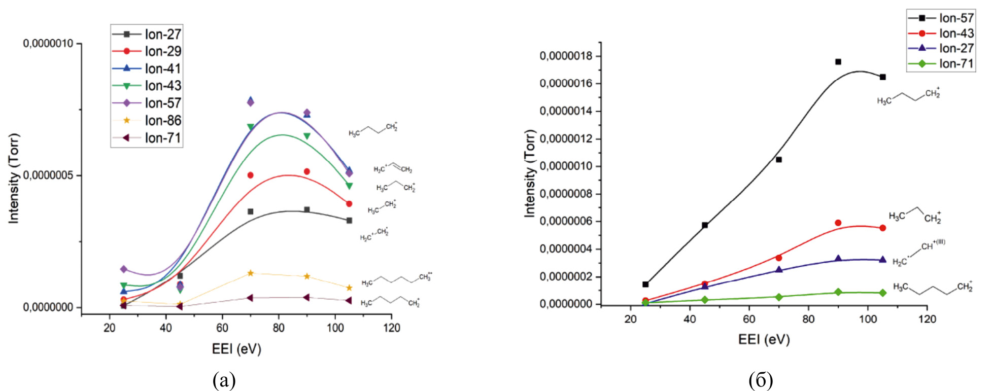 Рис. 4. Кривые эффективности ионизации для основных фрагментарных ионов (а) н-гексана, (б) 2,2,4-триметилпентана.