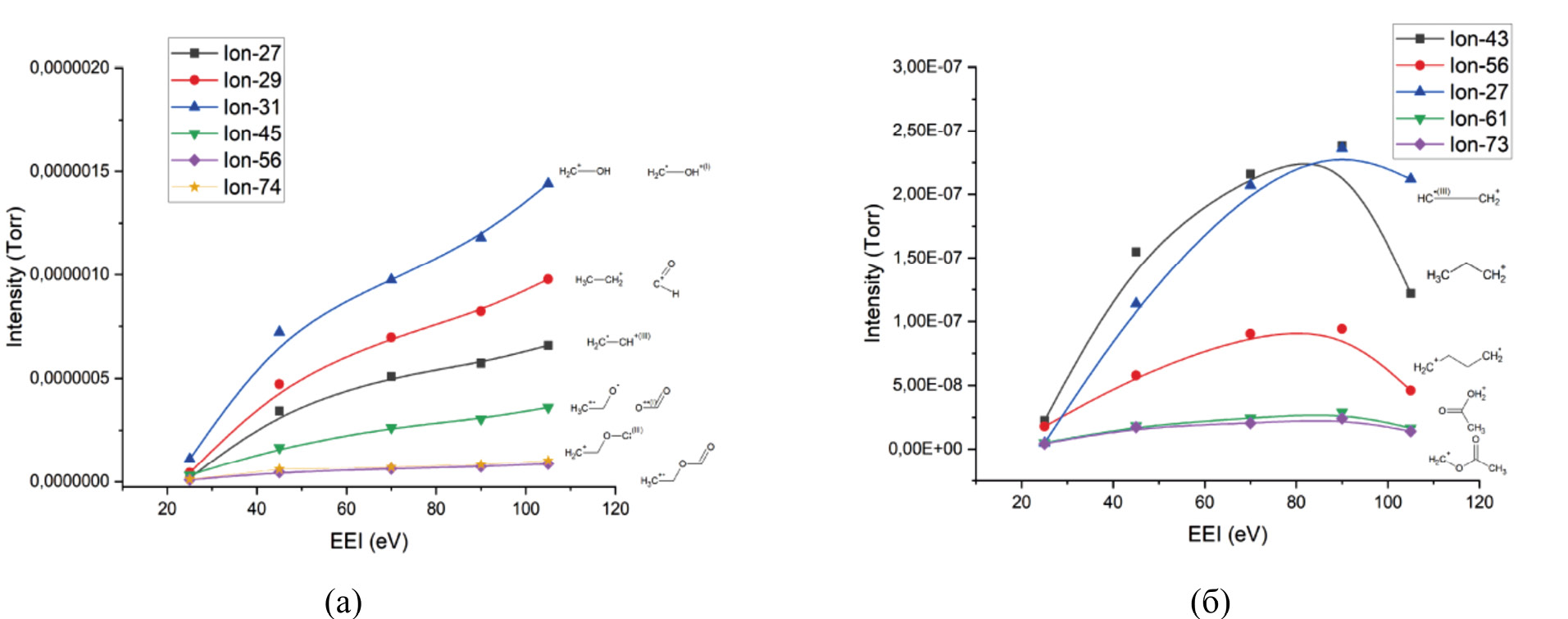 Рис. 5. Кривые эффективности ионизации для основных фрагментарных ионов (а) этилформиата, (б) бутилацетата.