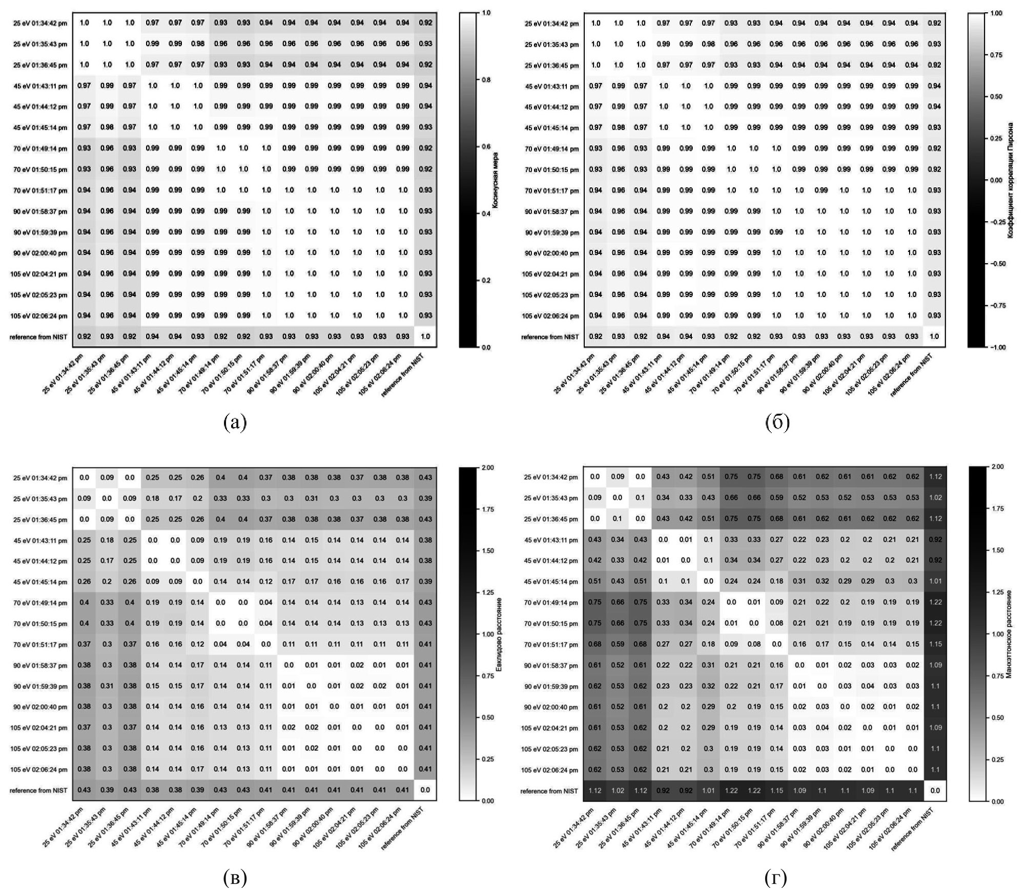 На рис. 6 приведены матрицы сходства спектров 2,2,4-триметилпентана, полученные на энергиях 25, 45, 70, 90 и 105 эВ, а также со спектром этого соединения из базы данных NIST. Эти матрицы позволяют сделать вывод о хорошем сходстве экспериментальных спектров 2,2,4-триметилпентана с эталонным спектром, взятым из БД NIST. Спектры на одинаковых уровнях энергий совпадают с хорошей точностью, о чем свидетельствуют значения косинусных мер и коэффициента корреляции Пирсона близкие к 1 и сравнительно небольшие значения расстояний, из чего следует сходимость эксперимента. При сравнении спектров, полученных при разных ЭЭУ, метрики показывают меньшее сходство.