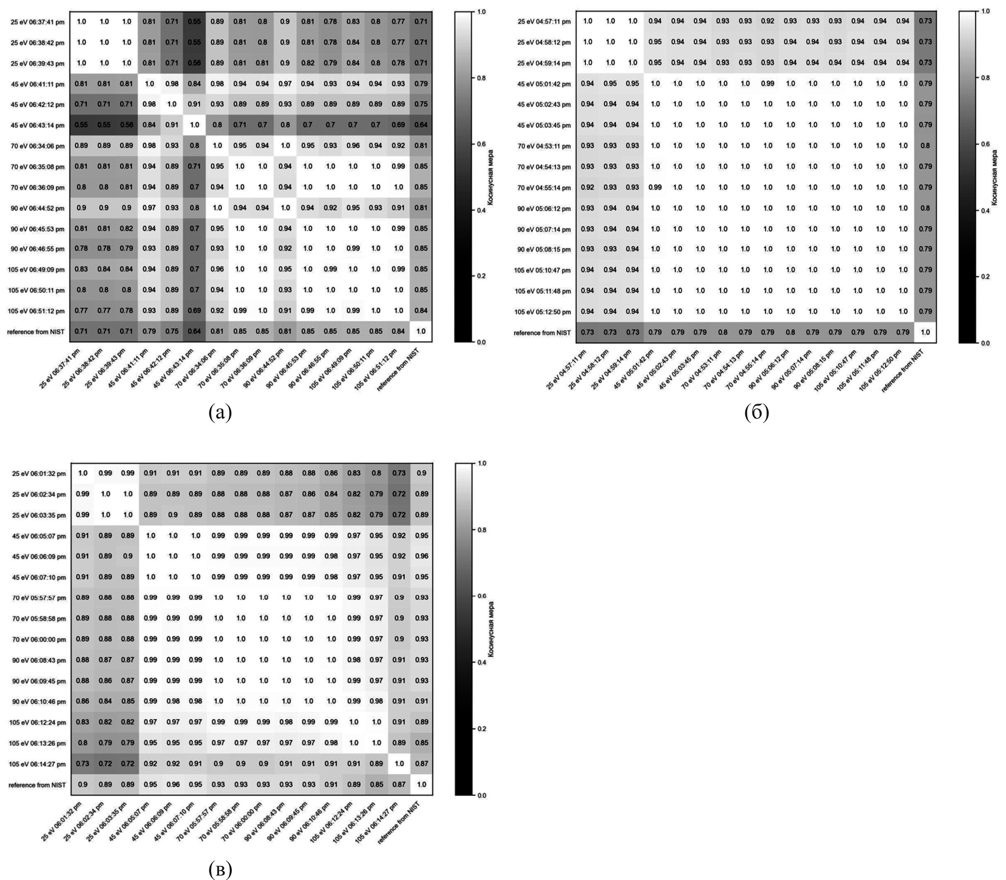 Матрица косинусных мер для серии масс-спектров н-гексана показывает наибольшее сходство с базой данных NIST при 70, 90 и 105 эВ (рис. 7а). При сравнении спектральных данных между собой на разных энергиях ионизации видно высокое сходство спектров, полученных при 70 эВ, со спектрами, полученными при других энергиях ионизации. В тоже время заметна слабая корреляция между образцами, измеренными при 25 и 45 эВ. Это связано прежде всего с различиями интенсивностей пиков или вовсе их отсутствием для малых осколочных катион-радикальных фрагментов молекулы. Матрицы косинусных мер для масс-спектров этилацетата и бутилацетата (рис. 7б, в) показывают хорошую повторяемость эксперимента, сходимость спектральных данных с БД-МС NIST, а также свидетельствуют о высоком подобии спектров при изменении ЭЭ.