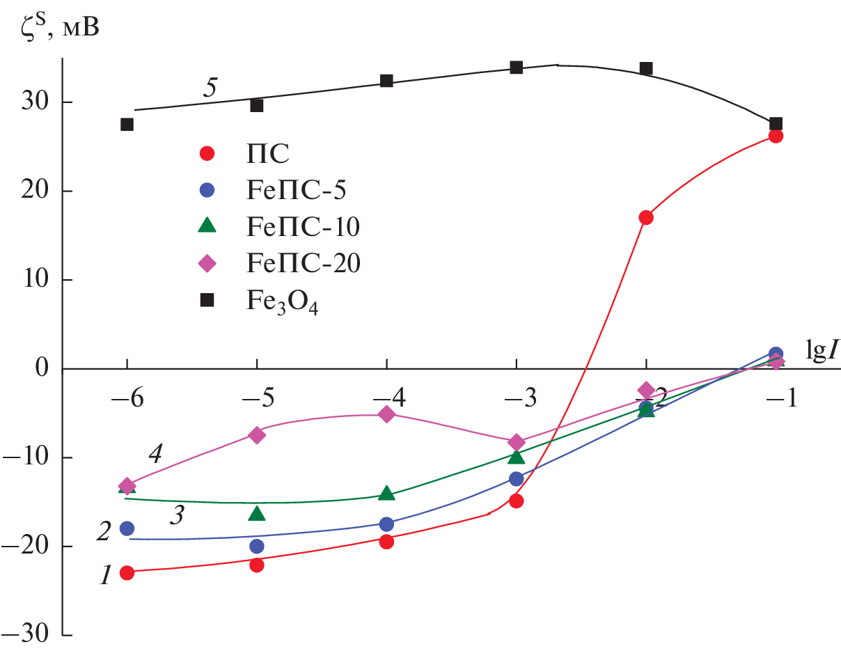 Powders of magnetite and its composites have been obtained on the basis of macroporous highsilica glass particles containing different amounts of Fe3O4. XRD, XPS, and Raman spectroscopy have been employed to confirm the formation of a magnetite phase in all iron-containing samples. The surface morphology and elemental composition of porous composite particles have been studied by SEM and EDX methods. It has been found that the external surface of porous silica particles is modified to different extents. It has been shown that the positions of the isoelectric point (IEP) and the values of the zeta-potentials for the composites coincide in indifferent electrolyte solutions. Two isoelectric points are observed in the pH dependences of the zeta-potential for the composite particles in nickel chloride solutions. In dilute solutions containing specifically adsorbed nickel ions and at pH values pHIEP-2, the electrokinetic properties of the composite particles are primarily affected by magnetite phase content in a composite powder and, at rather high concentrations of Ni2+ ions, by their specificity with respect to oxide surfaces.