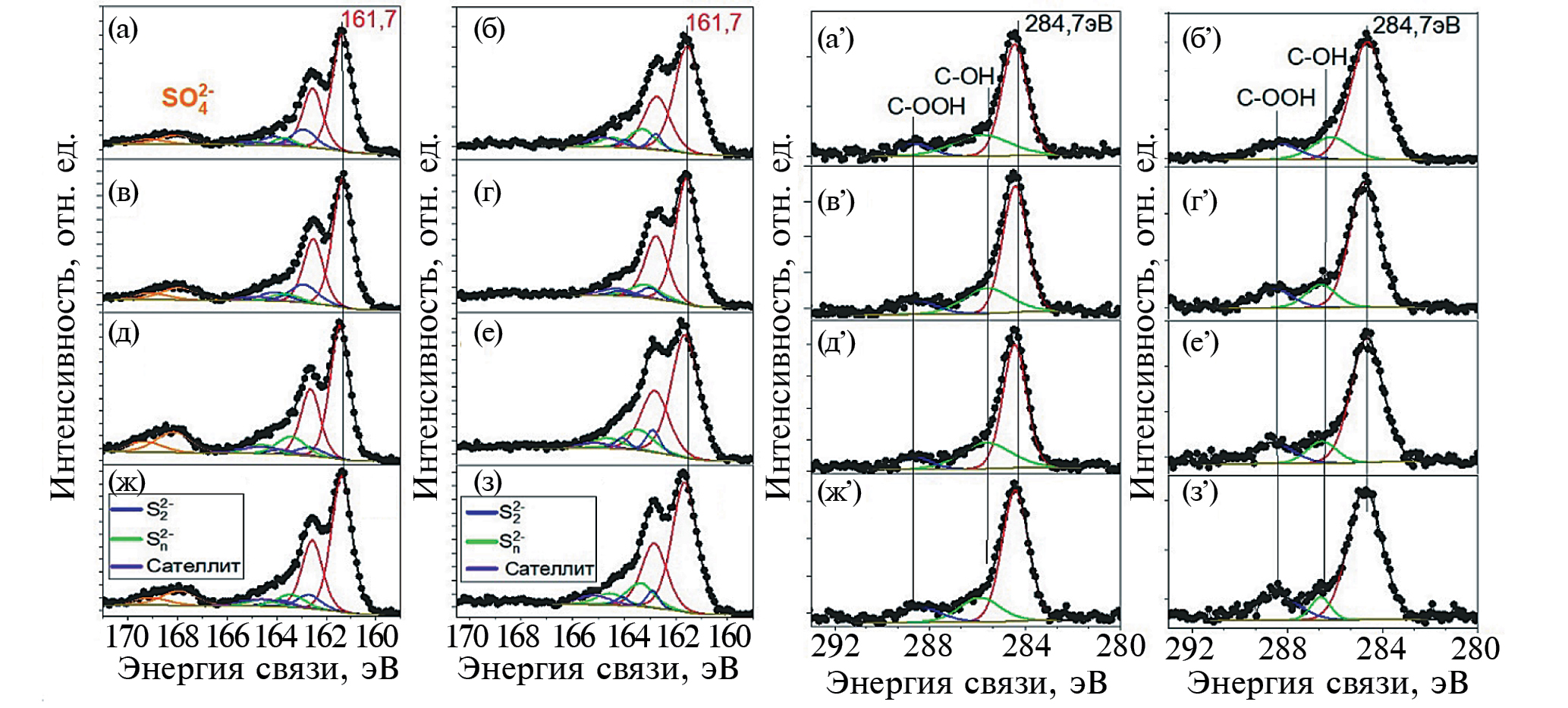 РФЭС спектры линии C 1s (рис. 3а’–3з’) могут быть хорошо подогнаны тремя компонентами: наиболее интенсивной с ЭС 284.7 эВ, соответствующей связи углерода в составе углеводородных загрязнений, и менее интенсивными с ЭС 286 и 288 эВ, отвечающими углероду в составе C-OH и C-OOH групп соответственно.
