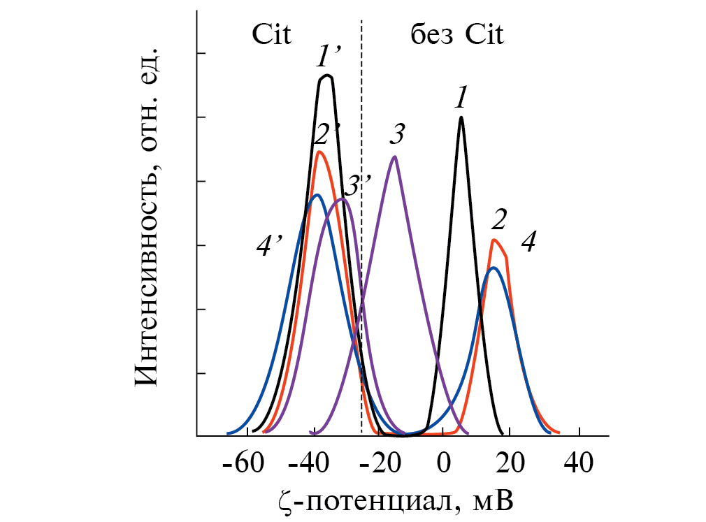 Рис. 4. Изменение дзета-потенциала сухих порошков до (кривые 1–4) и после (кривые 1՛–4՛) сорбции цитрата натрия.