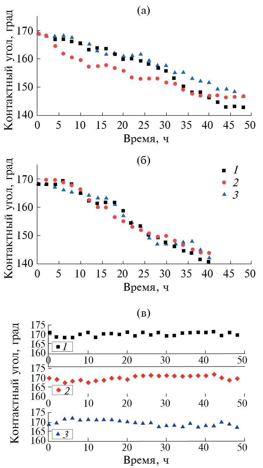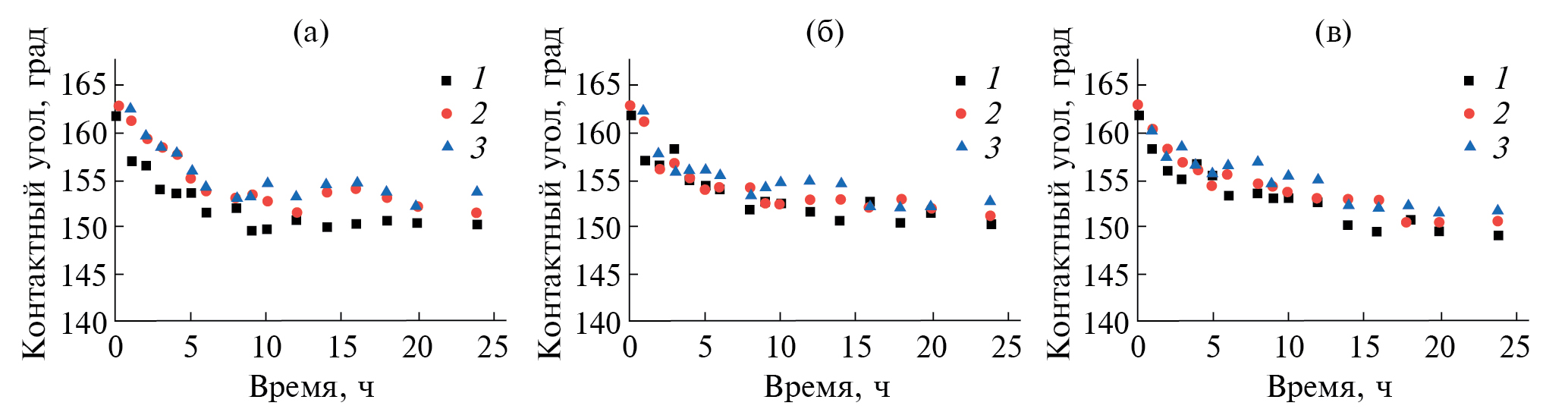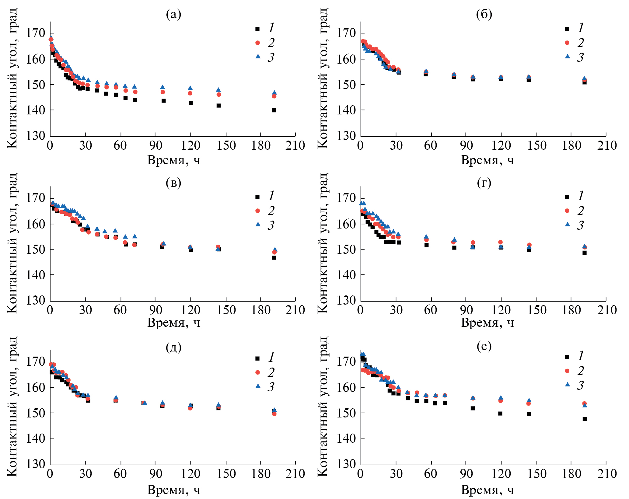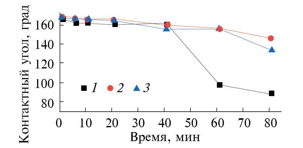 Из рис. 1 видно, что при контактах капель кислых и щелочных тестовых жидкостей наблюдается одинаковый характер зависимостей – монотонное снижение углов смачивания со временем контакта. При этом увеличение содержания фтора в мономерном звене оказывает положительное влияние на стабильность покрытия. Необходимо отметить, что щелочная среда (pH 11) оказывает более значимое воздействие: после 24 ч контакта в условиях атмосферы насыщенного пара характерно снижение контактного угла до 150°. В случае контакта с кислой средой характерен пролонгированный защитный эффект с сохранением супергидрофобного состояния до 35 ч.