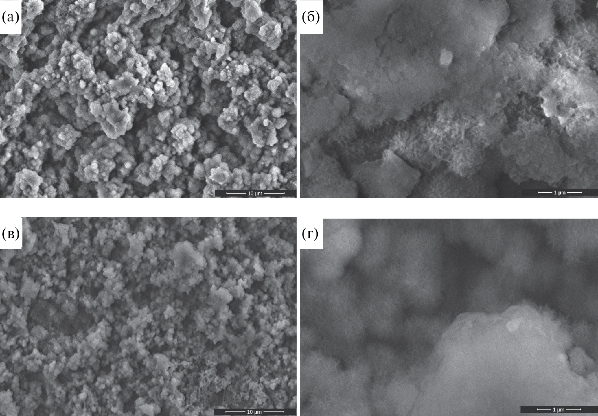 Рис. 4. СЭМ-изображение поверхности текстурированного алюминия, модифицированного поли-(ГБМА-со-ГМА), после 192 ч контакта с агрессивными средами: pH 2 (ax8000; б – x60000) и pH 11 (в – x8000; г – x60000).
