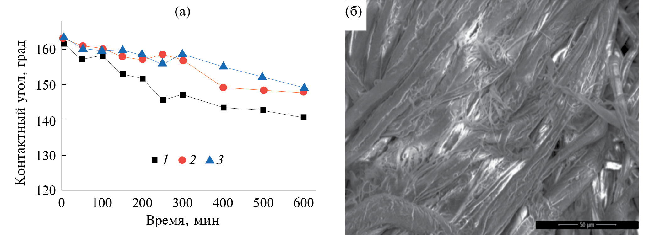 Волокна ХБТ в результате механического воздействия способны к обратимой деформации, что обеспечивает увеличение устойчивости гидрофобных свойств поверхности ХБТ, модифицированной сополимерами на основе фторалкилметакрилатов, к абразивному воздействию. Из рис. 8б видно, что на ткани в результате абразивного теста наблюдается разрушение поверхностных волокон и образование новой поверхности. Стоит отметить, что в ходе модификации молекулы гидрофобизатора могут закрепляться не только на поверхности волокон, но и мигрировать вглубь, что позволяет получать материалы, способные к восстановлению свойств. В результате отмывки образцов ХБТ, подвергнутых испытанию в течение 600 мин, в МЭК наблюдается восстановление углов смачивания выше 160° за счет подвижности микроструктуры и перераспределения макромолекул модификатора на поверхности волокон и микроволокон.