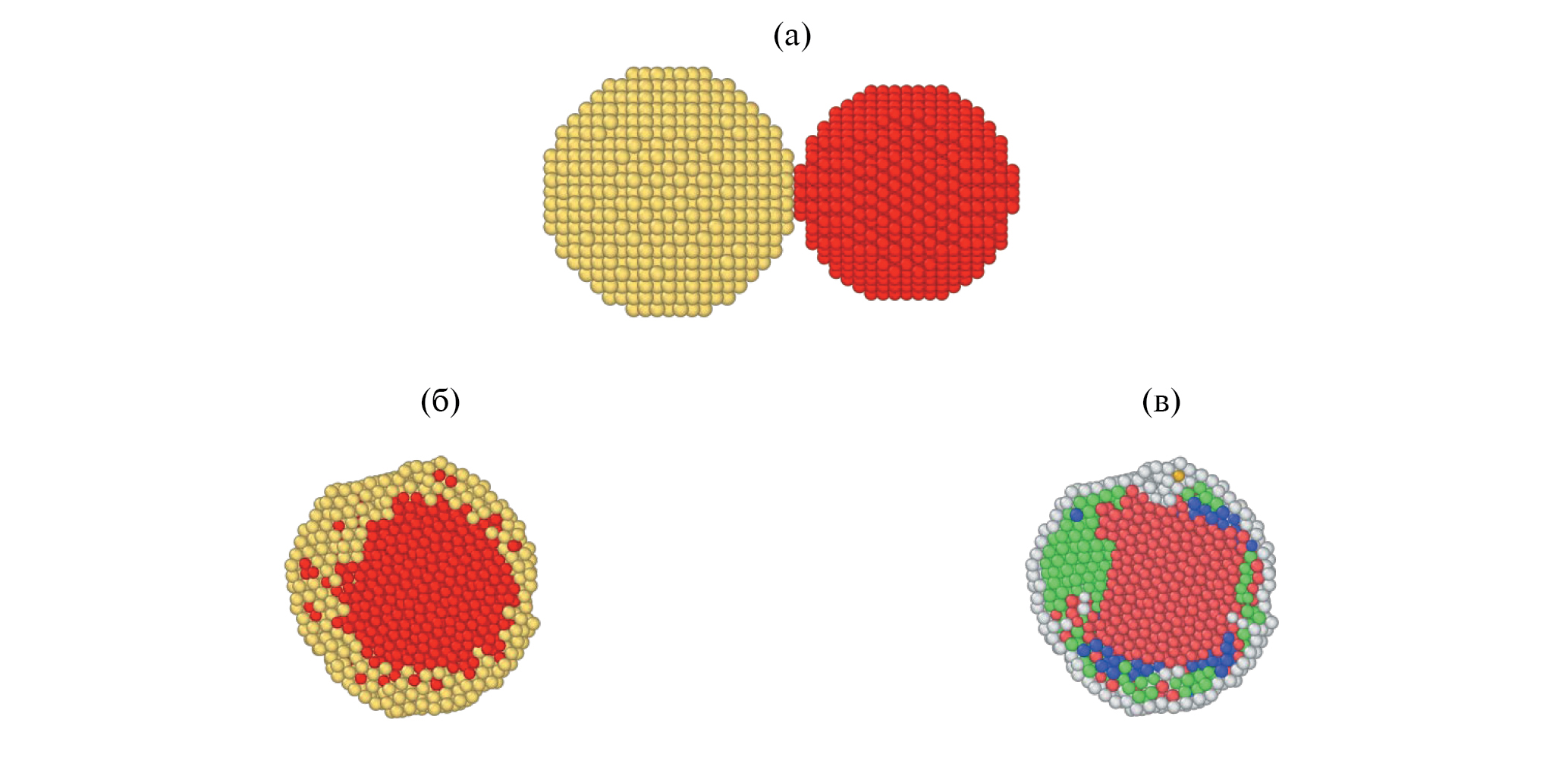На рис. 4 представлен интересный, на наш взгляд, пример проявления термической нестабильности системы из двух наночастиц, т. е. тенденции к укрупнению наночастиц, которая отмечалась в разделе 2, хотя и не входит в представленную там классификацию. Вместе с тем рис. 4б можно рассматривать и как иллюстрацию более высокой стабильности наноструктуры ядро–оболочка Co@Au по сравнению с инверсной наноструктурой Au@Co, поскольку именно биметаллическая наноструктура с оболочкой из атомов Au формируется в результате коалесценции исходных наночастиц. В отличие от предыдущих рисунков, представленные здесь МД результаты получены с использованием альтернативного силового поля – потенциала сильной связи [68]. При моделировании данной системы также применялся алгоритм термостатирования Нозе–Гувера. Коалесценция была индуцирована нагревом исходной системы (рис. 4а) от 300 до 1200 К. Эта конечная температура превышает температуру плавления наночастиц Au данного размера, тогда как частицы Co остаются в кристаллическом состоянии. Шаг интегрирования выбирался равным 1 фс, а скорость изменения температуры в процессе коалесценции составляла 0.5 К/пс.