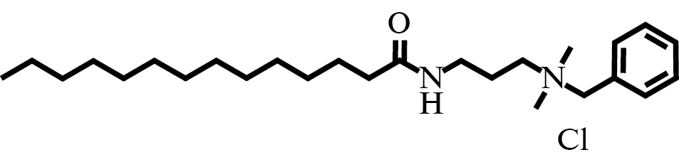Для улучшения механических свойств материала могут быть использованы наноалмазосодержащие покрытия [6]. Показано, что наноалмазы не ухудшают состояние крови [7, 8]. Функционально развитая поверхность наноалмазов детонационного синтеза позволяет наносить на их поверхность различные лекарственные средства [9–13], в том числе антибиотики, что критически важно в первое время после операции по пересадке сердечного клапана [10, 14–16]. Показана антимикробная активность карбоксилированных наноалмазов в водной суспензии в отношении Escherichia coli [17], которая может быть усилена использованием антибиотиков. Сильным антимикробным средством является бензилдиметил[3-(миристоиламино)пропил]аммонийхлорид, известный под коммерческим названием Мирамистин® (структурная формула приведена на рис. 1) [18, 19]. Однако при адсорбции на наноалмазах антисептические свойства мирамистина теряются [20]. Для сохранения антимикробных свойств мирамистина в составе комплекса с наноалмазами предложено провести предварительную модификацию поверхности наноалмазов биополимерами, чтобы изменить центры взаимодействия мирамистина с поверхностью при адсорбции. Одним из возможных биополимеров может быть белок лизоцим, который обладает собственной антимикробной активностью, а также способен образовывать комплексы с мирамистином. Показано, что образование композита лизоцим–мирамистин приводит к усилению бактериолитической активности лизоцима [21].