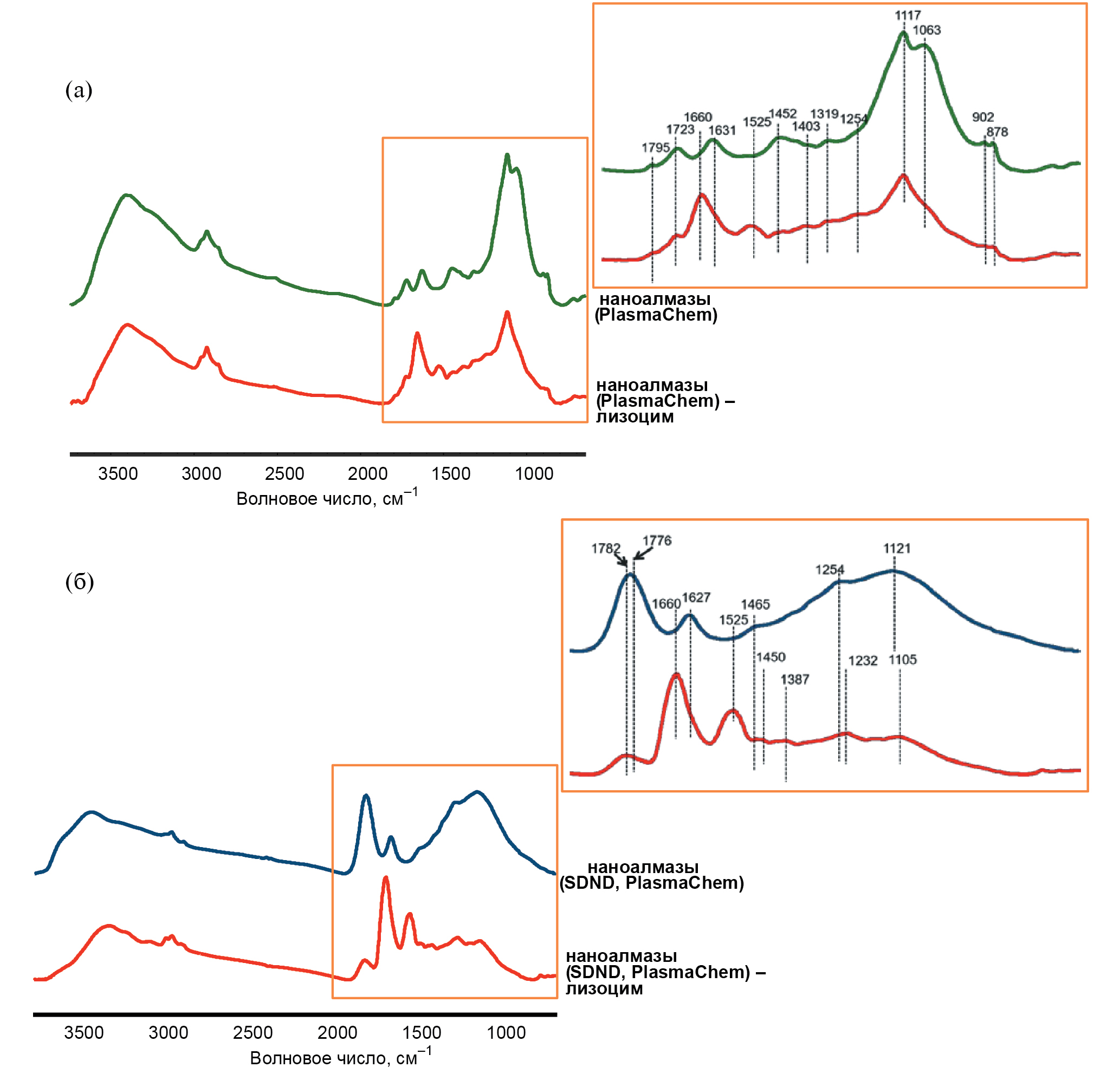 Расшифровку ИК-спектров проводили согласно работе [27]. В ИК-спектрах присутствует широкая полоса при 3400 см-1, обусловленная наличием поверхностных гидроксильных групп и адсорбированной воды. Сигнал в области 2900 см-1 указывает на Сsp3Н-связи. Полоса в области 1630 см-1 связана с адсорбированной на поверхности водой. Сигналы 1723 см-1 обусловлены растяжением связи С=О карбонильных групп, а в области 1790 см-1 – растяжение С=О связей карбоксильных групп и ангидридов. Сдвиг полосы 1776 см-1 в область 1782 см-1 (рис. 2б) свидетельствует об участии во взаимодействии лизоцим–наноалмаз карбоксильных групп на поверхности наноалмазов. Полосы в области 1450 см-1 обусловлены асимметрическими изгибами СНх-групп. Сигналы в области 1320–1370 см-1 обусловлены симметричным растяжением С=О связей. Полоса 1254 см-1 обусловлена изгибом С-О связей. Полосы 1117–1120 см-1 и 1063 см-1 получаются из-за асимметрических изгибов связей С-О-С и растяжений связи С-О. Интенсивность второго сигнала усиливается при адсорбции лизоцима на алмазе.