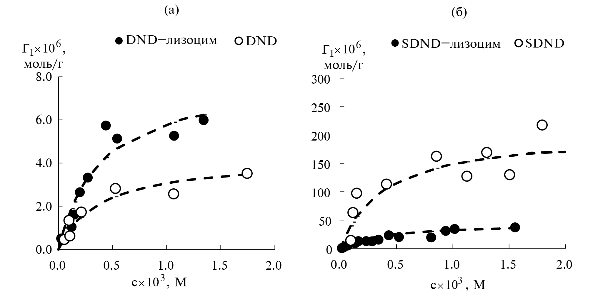 При исследовании адсорбции мирамистина на модифицированных лизоцимом наноалмазах к суспензии наномалмазов с концентрацией 1 мг/мл добавляли лизоцим до конечной концентрации 4.7 мг/мл. Суспензии инкубировали при 25°C в течение 48 ч, затем центрифугировали при 12100×g, осадок декантировали, промывали водой. Полученные наноалмазы использовали при исследовании адсорбции мирамистина по методике, описанной выше.