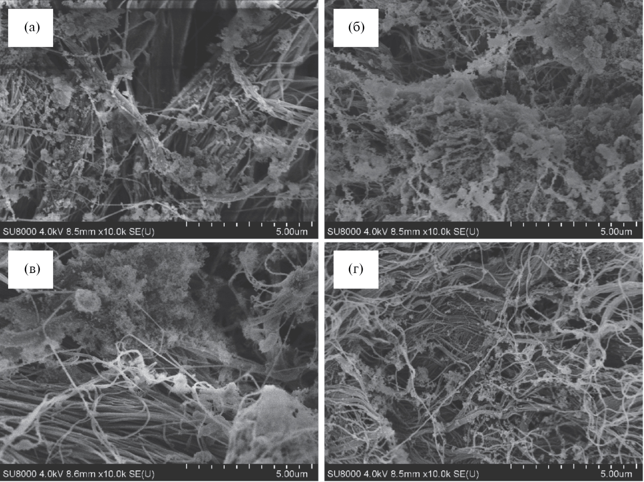 Рис. 4. СЭМ-изображения наноалмазсодержащих покрытий коллагеновой ткани бычьего перикарда: (а, в) – ворсистая сторона, (б, г) – гладкая сторона. (а, б) – DND, (в, г) – SDND.