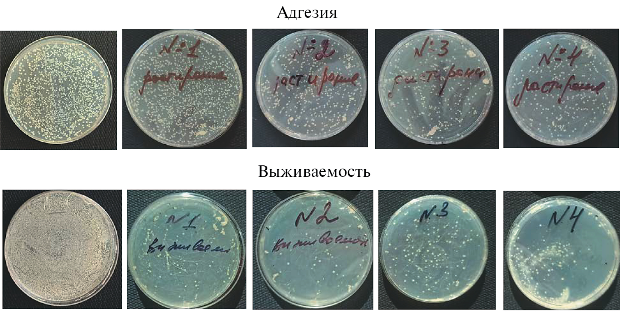 После проведенной аппликации каждую пластину растирали в 1 мл стерильного физиологического раствора со стерильной стеклянной крошкой. Полученные гомогенаты по 0.5 мл без разведения и с 10-кратным разведением помещали на плотную питательную среду Хинтона–Мюллера и растирали досуха стерильным шпателем. Посевы опытных и контрольных образцов на среде Хинтона–Мюллера инкубировали в термостате в течение суток при температуре 37°C. По окончании инкубации подсчитывали количество колоний жизнеспособных клеток тест-микроорганизмов на исследуемых и контрольных образцах.