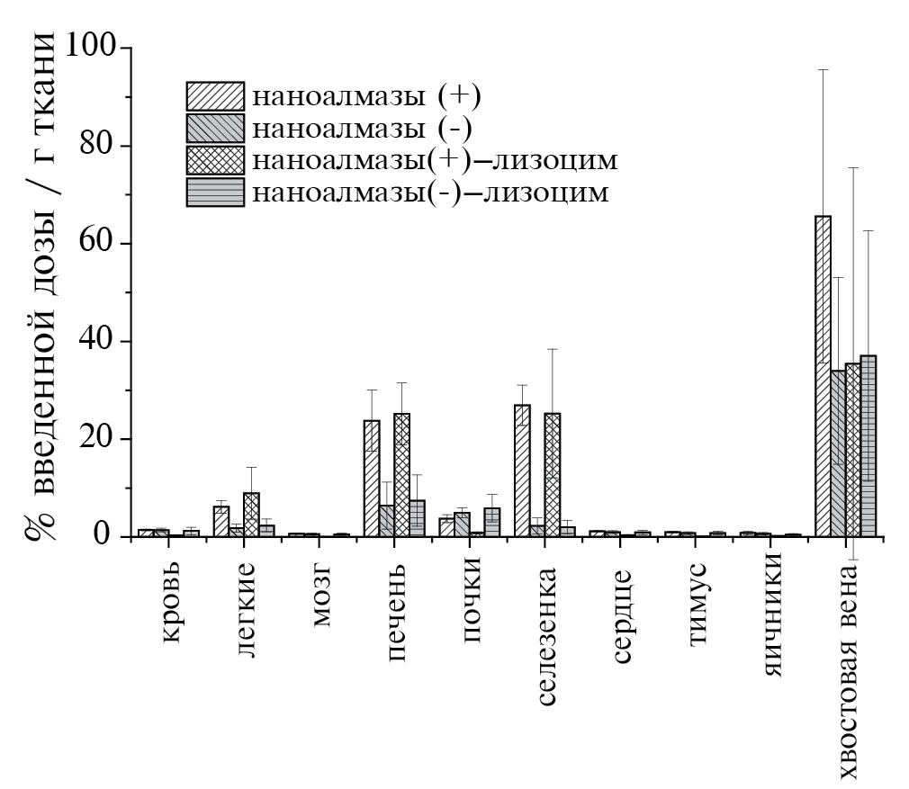Большая часть наноалмазов и комплекса наноалмаз–лизоцим остается в хвостовой вене. Значительное количество наноалмазов как исходного, так и модифицированного было обнаружено в печени и селезенке. Модифицирование поверхности наноалмаза лизоцимом приводит к снижению концентрирования “положительного” наноалмаза в хвостовой вене, однако такого эффекта не было в случае “отрицательного” образца. Некоторое количество наноалмазов и их комплексов с лизоцимом обнаружено в печени, селезенке и в меньшем количестве в легких и почках. Было обнаружено меньшее количество отрицательно заряженных наноалмазов во всех тканях, в том числе наблюдалось снижение в 3.5 раза для легких и печени, а для селезенки уменьшение концентрации наночастиц в случае отрицательного наноалмаза было в 11 раз. Модифицирование лизоцимом влияло только на концентрирование исходного наноалмаза в месте введения, как отмечалось выше, и не влияло на концентрирование в других тканях. Таким образом, показано, что лизоцим может быть использован как модифицирующий агент поверхности наноалмазов для снижения их агрегирования в месте введения и подавления адсорбции компонентов биологических жидкостей.