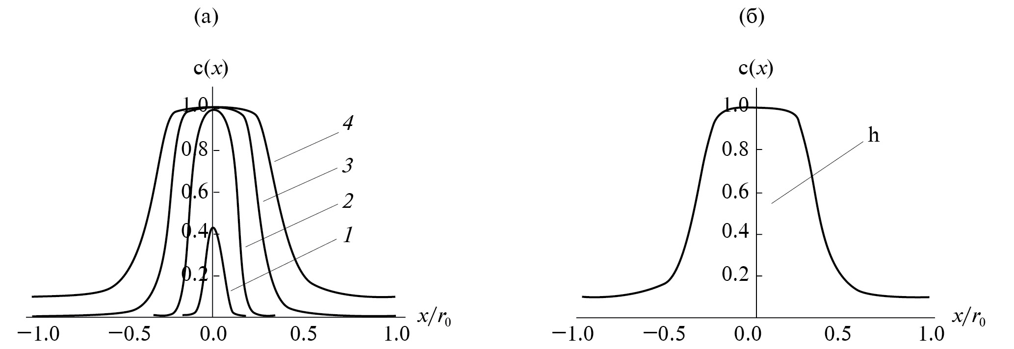 Решения уравнения (11), показанные на рис. 2, имеют определенные недостатки с точки зрения физики. Из графиков видно, что атомы примеси в сегрегации сосредоточены в тонком однородном слое, ширина которого оказывается меньше среднего размера атома примеси r0,AB . Это означает, что модель не учитывает реальных размеров атомов. Дело в том, что ширина слоя, занимаемого атомами, не может быть меньше размера этих атомов.