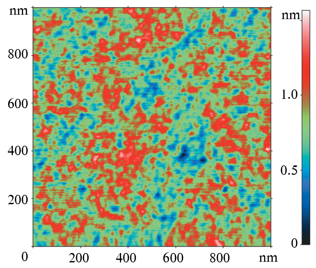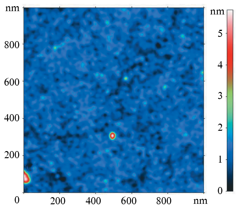 В результате анализа поверхности полиимидной пленки без добавления красителя с помощью ССМ выявлено, что высота рельефа составляет 0.5–1.5 нм с содержанием микропор 69.9% (рис. 1). В то же время анализ морфологии пленок ПМО показал, что происходит небольшое изменение количества пор и их размера (табл. 1) с преобладанием микропор, увеличивается шероховатость поверхности (табл. 2). При этом пленки ПМО-Е127 (рис. 2) и ПМО-Е132 (рис. 3) имеют незначительное количество дефектов поверхности, а высота рельефа составляет 3–4 нм. Таким образом, после удаления молекулы темплата на поверхности пленки остаются полости (молекулярные отпечатки), которые комплементарны по форме и размеру, а также по расположению функциональных групп в молекуле красителя.
