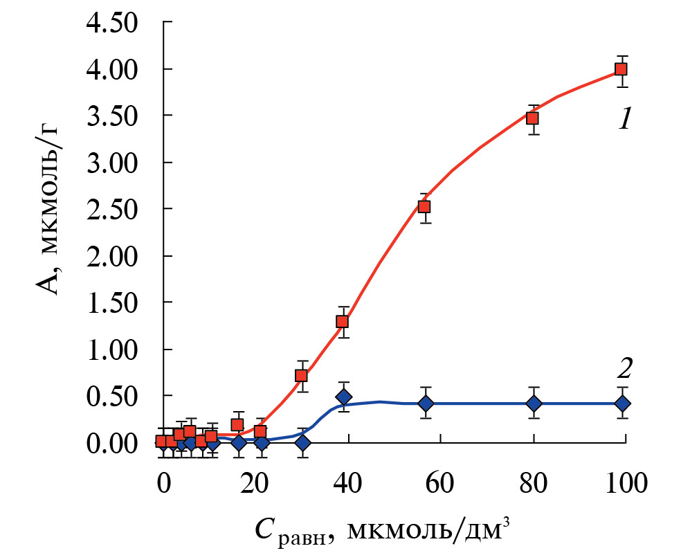 Рис. 6. Изотерма сорбции красителя эритрозина (Е127) (рН 6.90): 1 – ПМО-Е127; 2 – ПС.