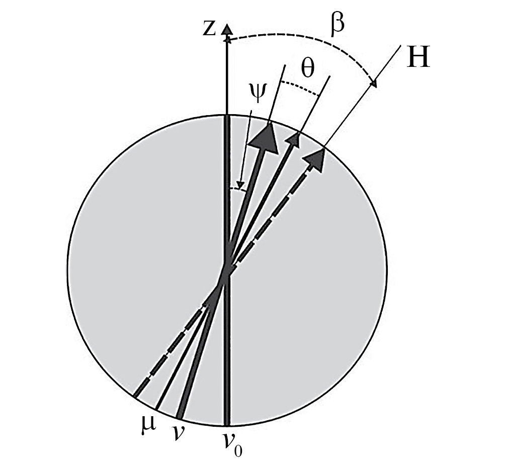 Рассмотрим ферромагнитную однодоменную частицу, помещенную в магнитное поле H. Схематическая ее иллюстрация приведена на рис. 1. Обозначим µ – единичный вектор, направленный вдоль магнитного момента частицы; ν – единичный вектор вдоль оси легкого намагничивания частицы; ν0 – начальное, до приложения поля, значение вектора ν.