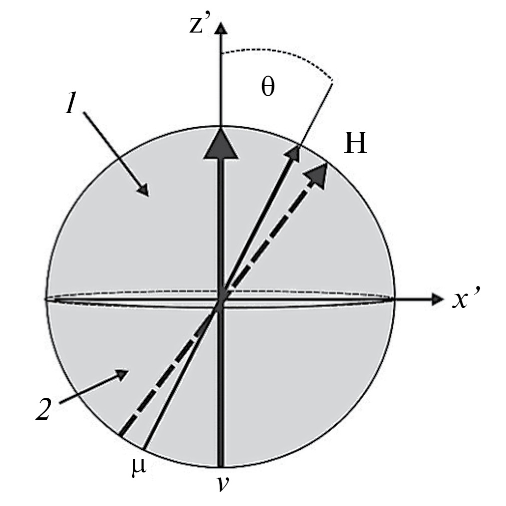 Для дальнейшего удобно ввести систему координат с осью Ozʹ, направленной вдоль вектора ν, и осью Oxʹ в плоскости, образуемой векторами ν и H. Обозначим θ и φ полярный и азимутальный углы вектора µ в этой системе координат (рис. 2).