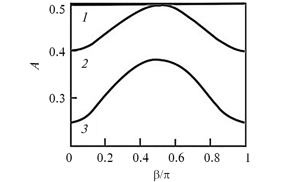 Рис. 3. Зависимость множителя A в (48.50) от угла b, показанного на рис. 1 для трех безразмерных модулей упругости несущей среды. Кривые 1, 2, 3: g = 0, 0.5 и 1.5 соответственно.