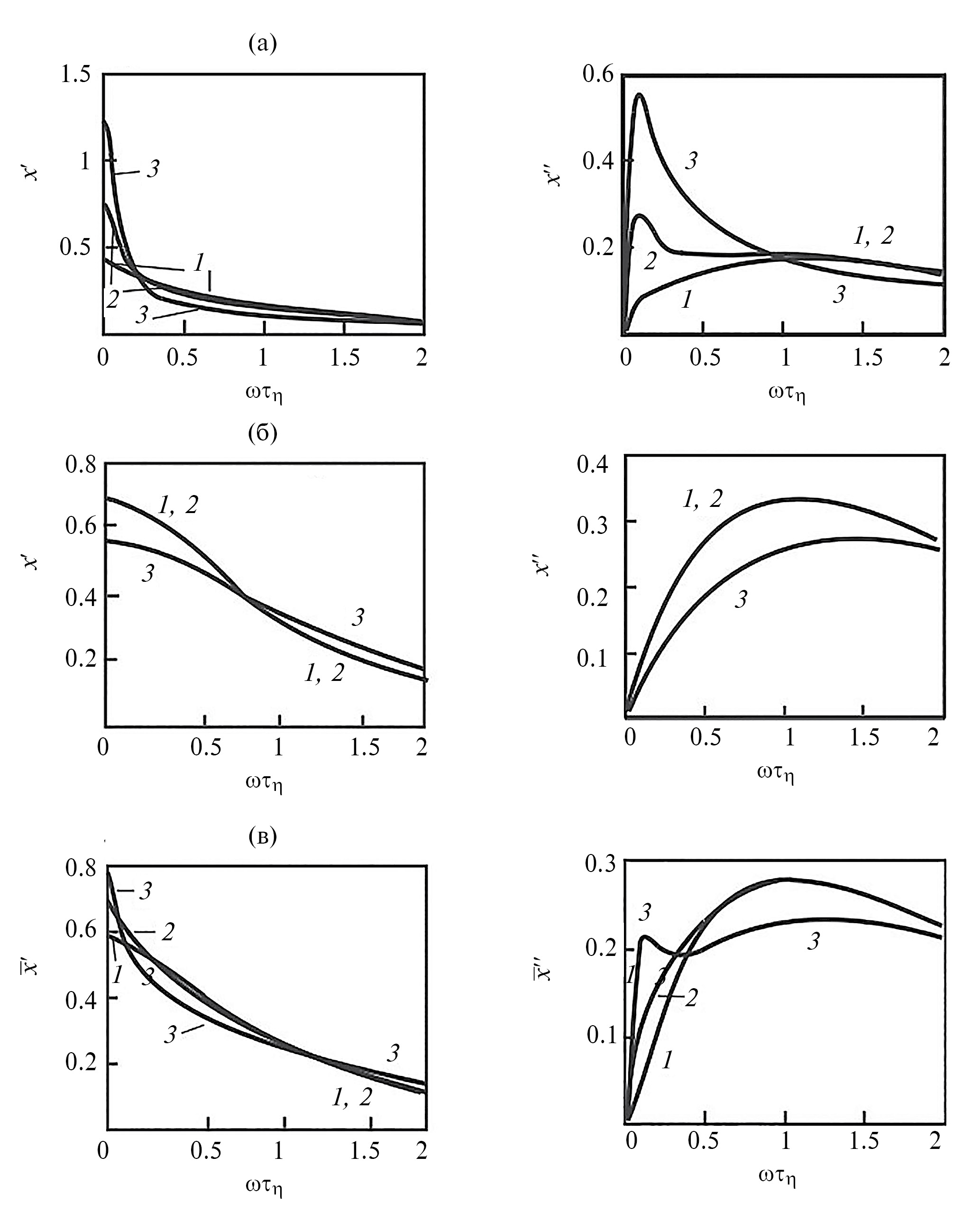Рис. 4. Реальная и мнимая части комплексной восприимчивости при tN = 10 τh (a) и (б): угол β равен 0 и π/2 соответственно; (в) – усредненные по β компоненты , определенные в (60). Кривые 1, 2, 3 – безразмерный коэффициент упругости g = 0.1, 0.5, 1.5 соответственно.