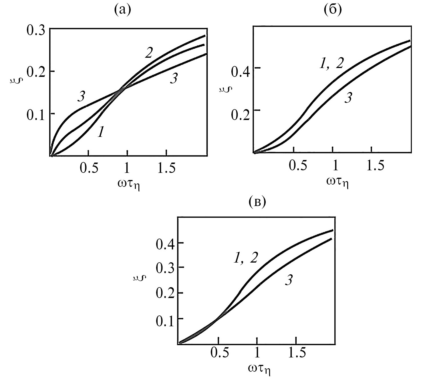 Рис. 5. Безразмерные параметры ξ(β) и генерации тепла частицей как функции от частоты поля. Значки а, б, в и 1, 2, 3 означают то же, что на рис. 4.