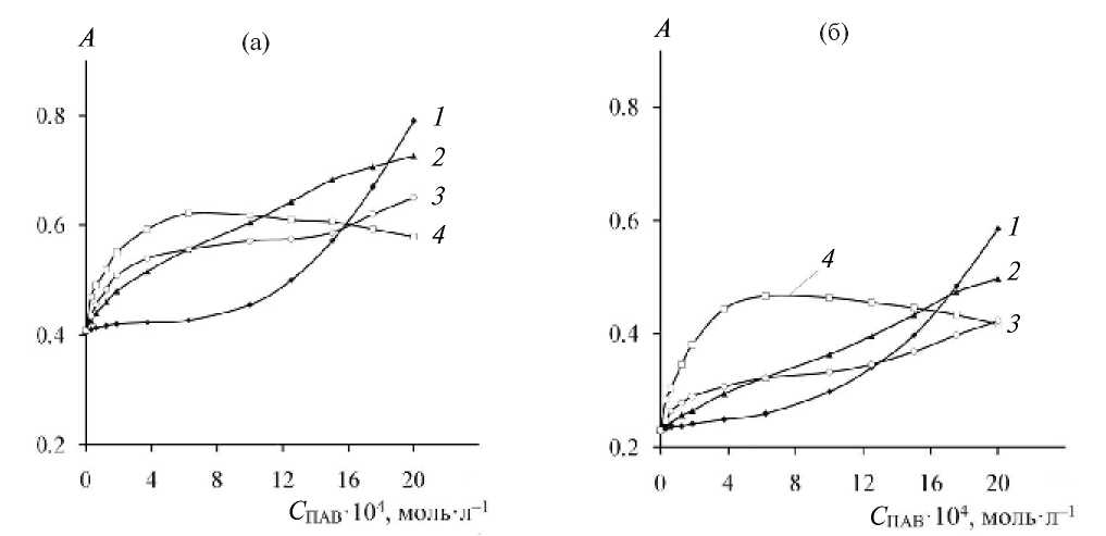 Рис. 1. Зависимость оптической плотности дисперсий УНТ (0.1% мас.) от концентрации ОЭ ВЖС в водных растворах через сутки (а) и через 30 суток (б) после УЗ-обработки: 1 – n = 7, 2 – n = 8, 3 – n = 3, 4 – n = 10.
