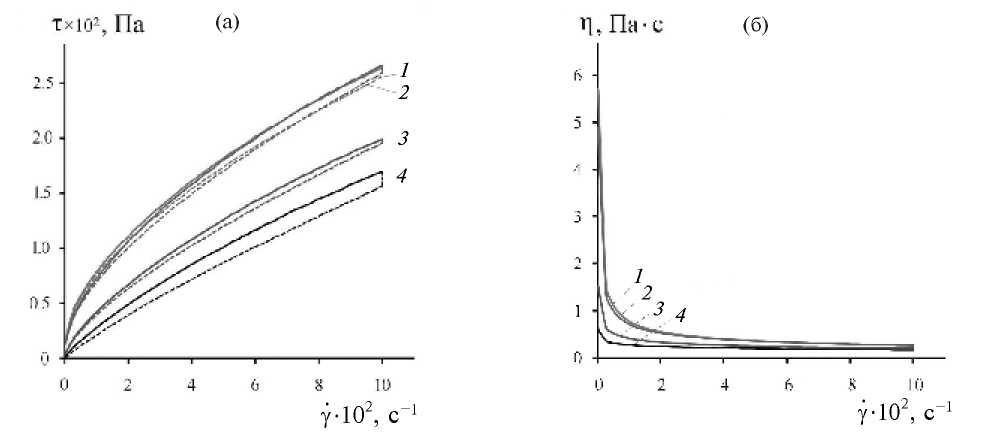 Рис. 5. Кривые течения (а) и вязкости (б) гелевых систем: 1 – базовый гель; 2 – гель с ОЭ ВЖС n = 10 (6.3∙10–4 моль/л); 3 – гель с УНТ (247 мг/л); 4 – гель с УНТ (378 мг/л) и ОЭ ВЖС n = 10 (6.3∙10–4 моль/л).