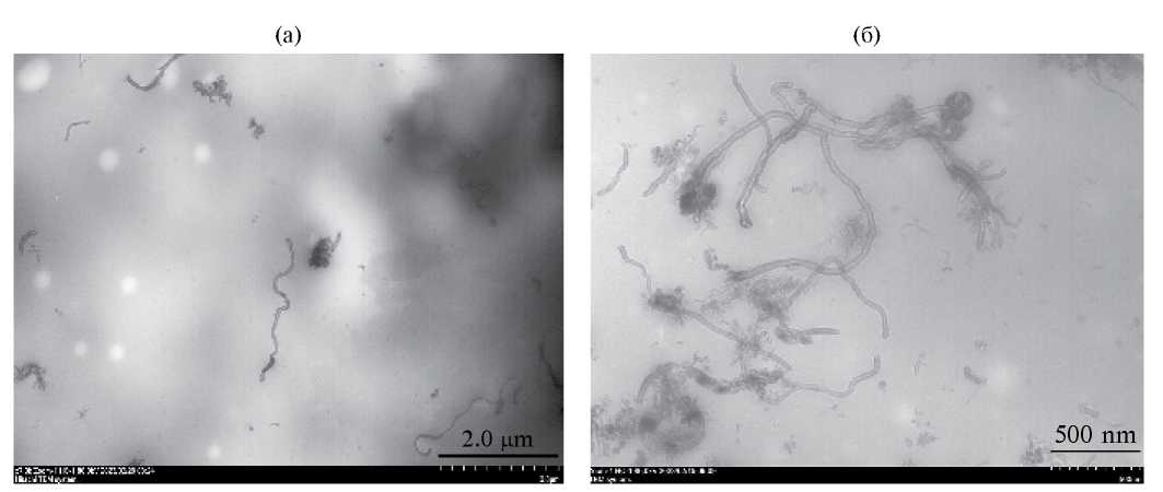Методом просвечивающей электронной микроскопии исследована ультраструктура пленочных образцов гелей с УНТ и ОЭ ВЖС n = 10. Микрофотографии гелевых систем, полученных с помощью дисперсий УНТ в воде и водном растворе ОЭ ВЖС n = 10, представлены на рис. 6. Из анализа рис. 6б следует, что в объеме геля в основном находятся индивидуальные нанотрубки с диаметром 20–40 нм. На микрофотографии, представленной на рис. 6б, можно увидеть элементы сетки из нанотрубок, что не наблюдается для системы, полученной с помощью дисперсии УНТ в воде в отсутствии НПАВ (рис. 6а), что связано с низким содержанием нанотрубок в объеме коллоидной системы. Очевидно, что наличие сетки из УНТ способствует увеличению электрической проводимости. Получение более развитой электропроводящей сетки возможно при увеличении количества углеродных нанотрубок до достижения порога перколяции, что стимулирует дальнейшие исследования наномодифицированных гелевых систем.