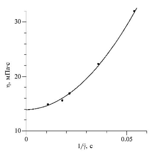 Рис. 1. Зависимость динамической вязкости исходного образца первой жидкости от обратной скорости сдвига. Сплошная линия – аппроксимация параболой.