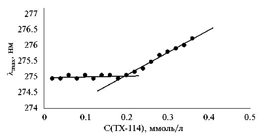 Аналогичная зависимость была построена для растворов ТХ-114 с концентрациями 0.02–0.30 ммоль/л. Также были установлены два прямолинейных участка и наблюдали характерный излом в области концентраций 0.16–0.20 ммоль/л (рис. 6). В области низких концентраций прямая, параллельная оси абсцисс, соответствовала значению λmax 274.95 ± 0.04 нм. При повышении концентрации – батохромные сдвиги полосы поглощения до 276.40 ± 0.25 нм, описывались прямой линией, соответствующей уравнению y = 7.33С+273.41 (R2 = 0.994).