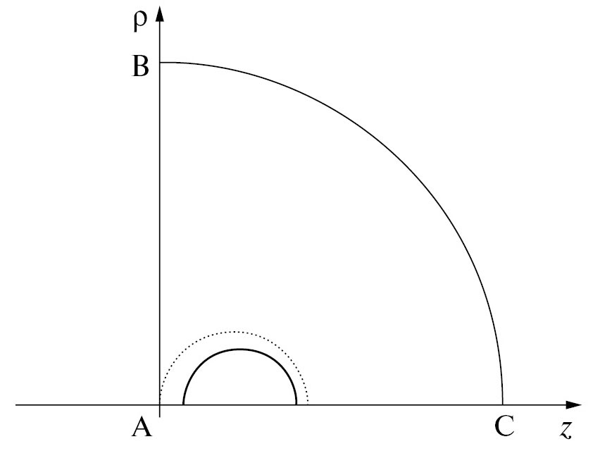 Толстой линией показана граница, соответствующая поверхности частицы. Пунктирной – вспомогательная граница (см. ниже). Линия AC соответствует оси симметрии задачи, проходящей через центры частиц. Линия AB соответствует плоскости симметрии задачи, находящейся на одинаковом расстоянии от центров частиц. Линия ВС соответствует внешней границе системы. Потенциал на этой границе полагается равным нулю. Ее радиус выбирается таким, чтобы потенциал на ней при решении уравнения (1) в неограниченной области был бы как минимум в 5 · 103 раз меньше, чем потенциал на поверхности частиц. Этот радиус находится численным решением уравнения