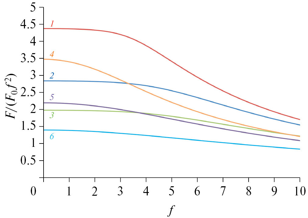 На рис. 2–4 показаны зависимости нормированных сил отталкивания, действующих на частицы шарообразной формы, от нормированного расстояния между их поверхностями при разных значениях k, f и ε. С ростом расстояния между поверхностями частиц их поляризация уменьшается. Поэтому, как и следовало ожидать, значения сил при разных значениях ε с ростом расстояния между частицами стремятся друг к другу.