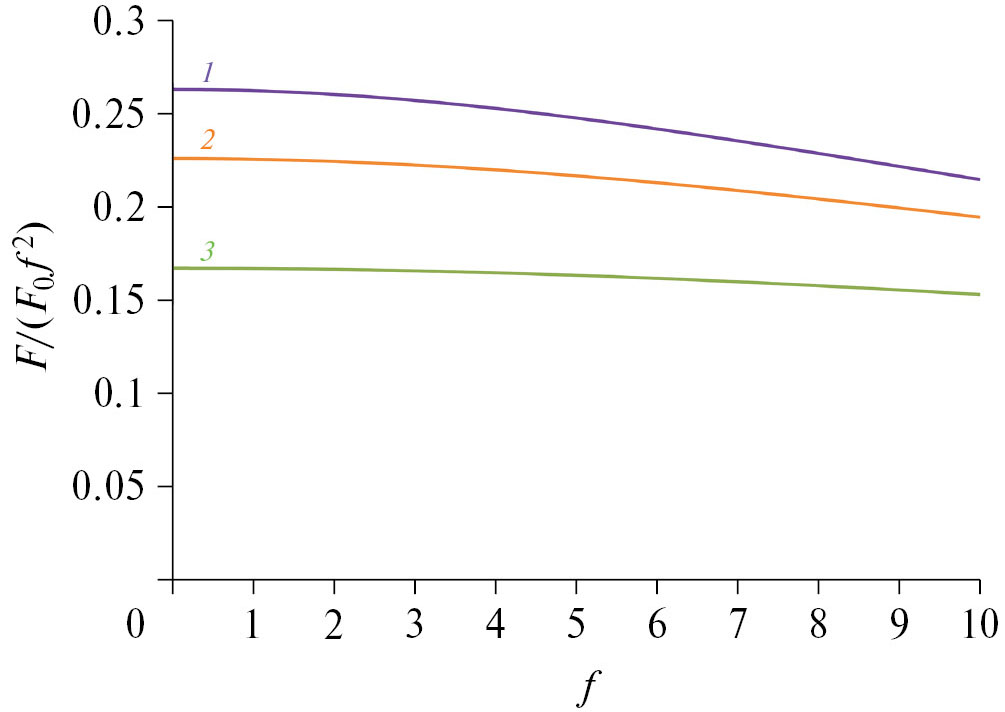 Рис. 6. Зависимость нормированной силы электростатического взаимодействия частиц от f при h/a = 0.1 и k = 10: 1 – ε = 0.1; 2 – ε = 1; 3 – ε = 10