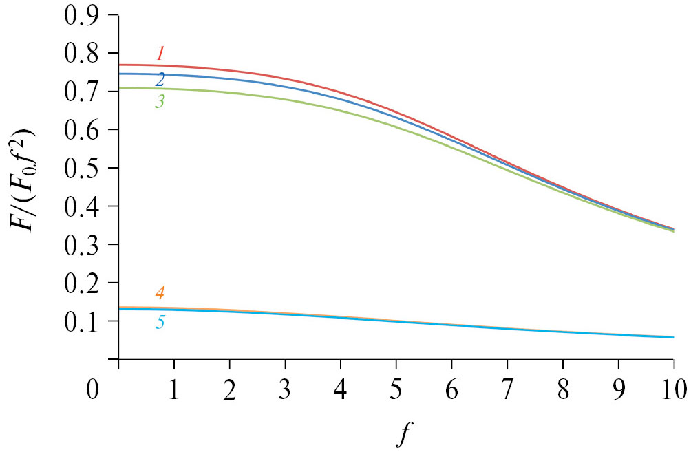 Рис. 7. Зависимость нормированной силы электростатического взаимодействия частиц от f при h/a = 2: 1 – k = 0.1, ε = 0.1; 2 – k = 0.1, ε = 1; 3 – k = 0.1, ε = 10; 4 – k = 1, ε = 0.1; 5 – k = 1, ε = 10