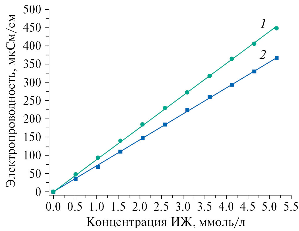 Для оценки скорости перехода в водную фазу ионных жидкостей, находящихся в составе ионогелей, использовали кондуктометр Эксперт 002 (НПП “Эконикс”, Россия). Образцы ионогелей, помещенные в стальные крупноячеистые (~16 меш) контейнеры, погружали в 500 мл деионизованной воды при перемешивании на магнитной мешалке (300 об/мин). Датчик кондуктометра помещали в ту же емкость, показания регистрировали в течение 24 ч. Концентрацию ионных жидкостей в водных растворах определяли по предварительно построенным калибровочным зависимостям (рис. 1). Полученные значения коэффициентов, связывающих электропроводность и концентрацию водных растворов ИЖ, k([мкСм/см]/[ммоль/л]), составили 87.9 ± 0.3 (R2 = 0.999, BMIM DCA) и 71.2 ± 0.2 (R2 = 0.999, BMIM TFSI).