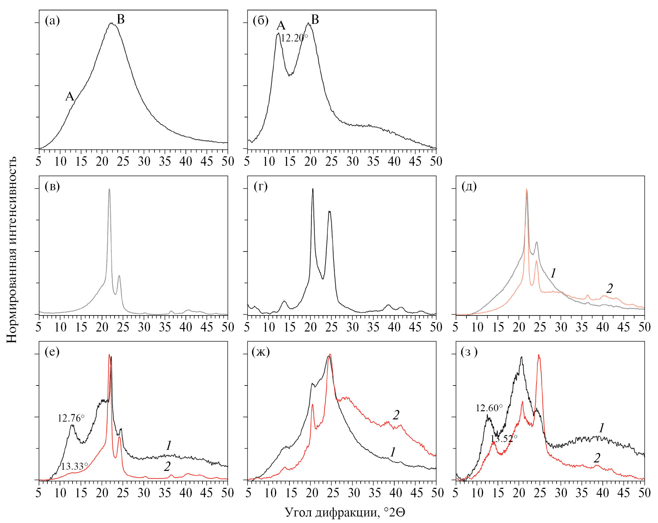 Дифрактограммы образцов были получены с использованием порошкового рентгеновского дифрактометра Haoyuan DX2700BH (КНР) в диапазоне дифракционных углов 5–60 °2θ (CuKα излучение).
