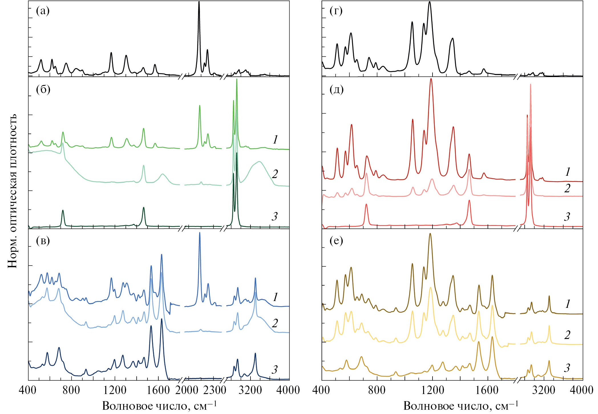 Рис. 4. ИК-спектры высокопористых полимеров, а также соответствующих ионогелей до и после выдерживания в воде в течение суток. Оптическая плотность ионогелей нормирована на интенсивность полос 1466 см–1 (ПЭВД) или 1632 (ПА) см–1. (а) BMIM DCA, (б) ПЭВД-DCA-M, (в) ПА-DCA-М, (г) BMIM TFSI, (д) ПЭВД-TFSI-M, (е) ПА-TSFI-M. Кривые 1 – ионогели до контакта с водой, 2 – ионогели после выдерживания в воде, 3 – спектры соответствующих полимеров