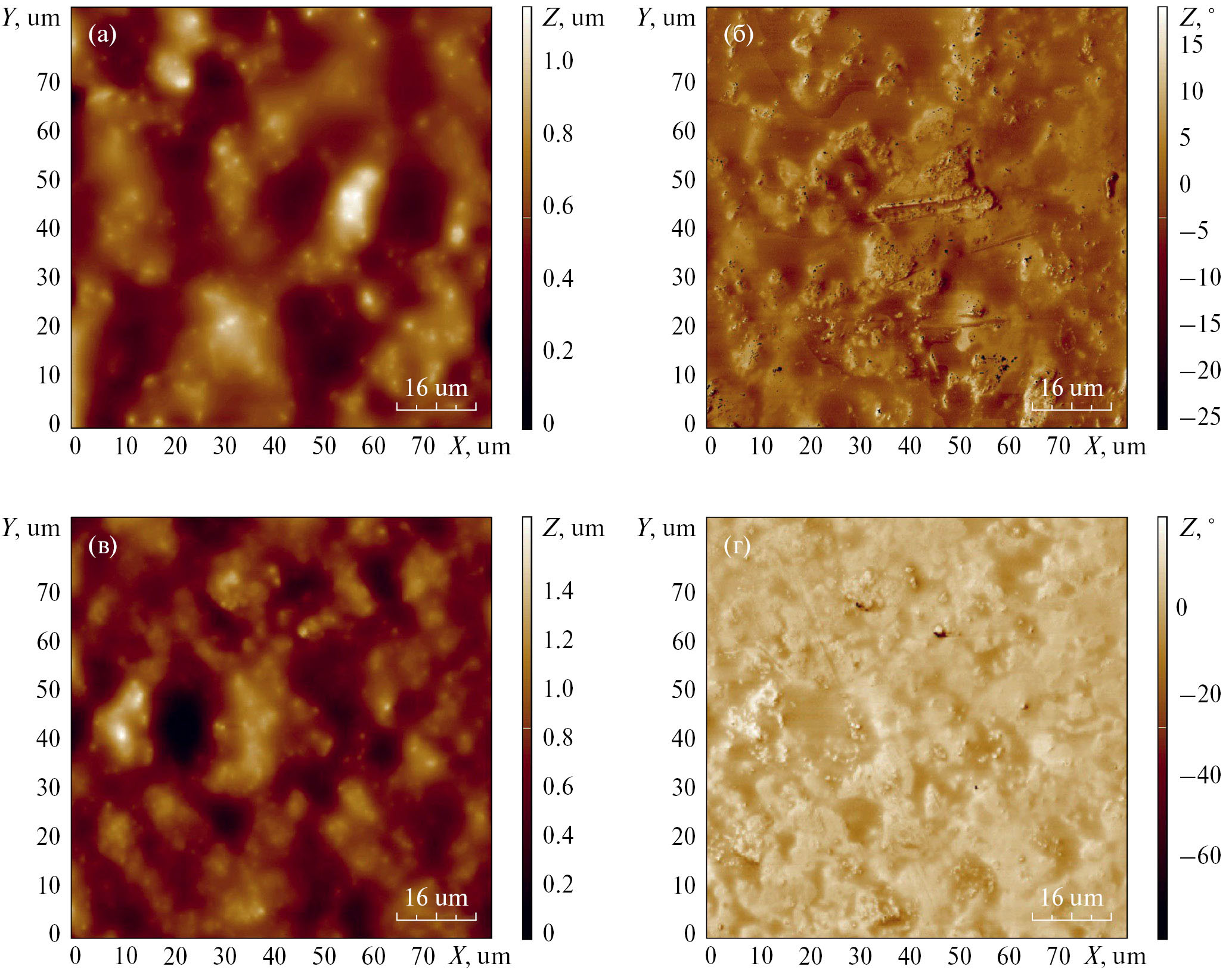 Рис. 1. АСМ-изображения покрытий из ОСК на основе кремнийорганического лака КО-921, модифицированных 17 масс. % ПДМС с отвердителями: а, б) – 0/2 масс. % ТБТ; в, г) – 2 масс. % АГМ-9