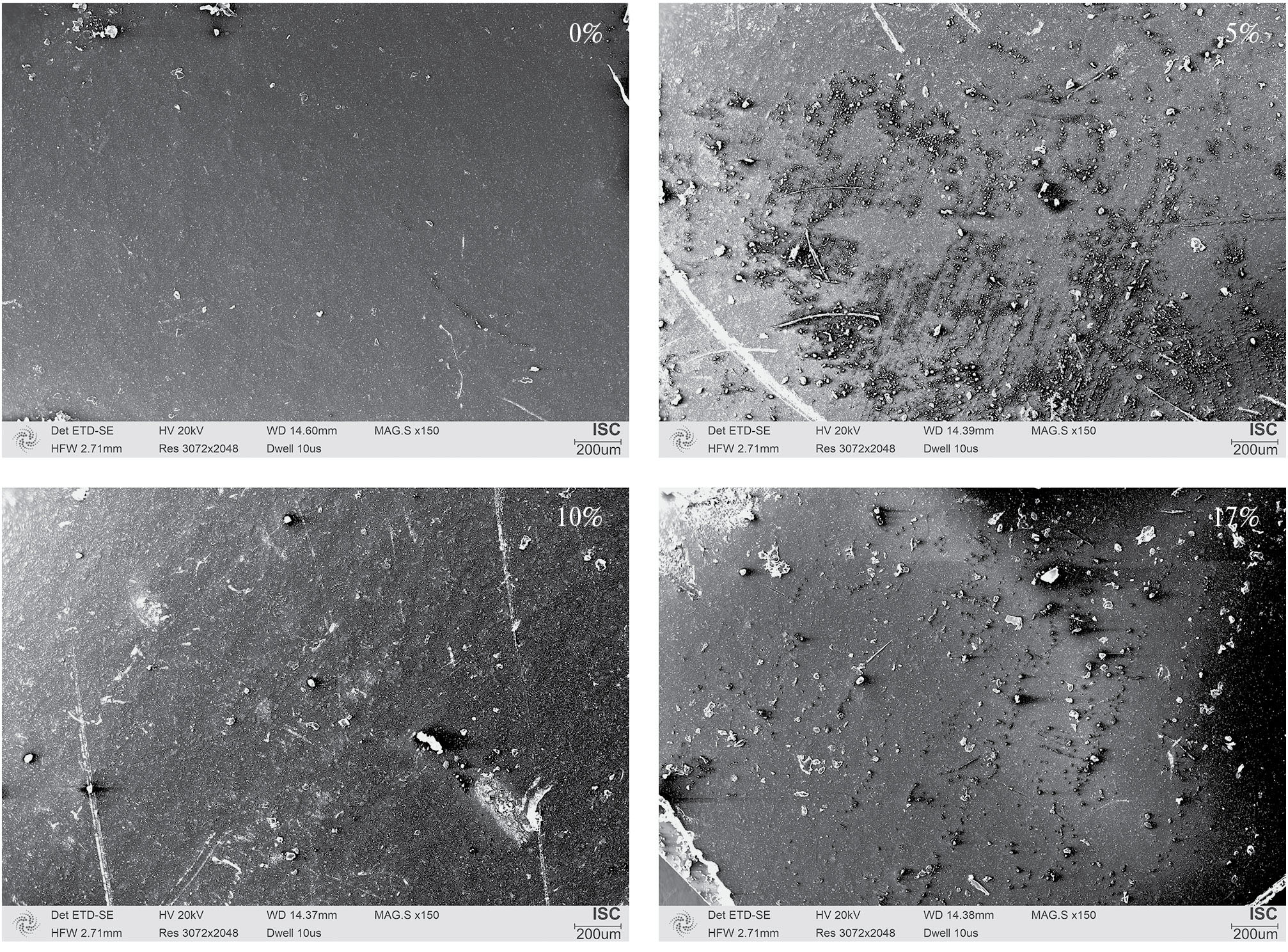 На СЭМ-изображениях видны неровности на поверхности образцов, содержащих 5, 10 и 17 масс. % (на образце без ПДМС эти неровности отсутствуют).